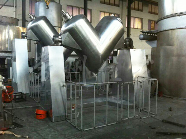 該機通過機械傳動,使不對稱的V型圓柱體內(nèi)的物料做往復(fù)翻動,達到均勻混合之目的。