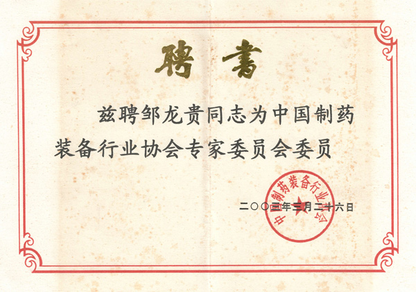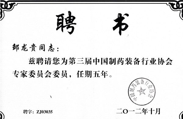 制藥裝備協(xié)會(huì)專(zhuān)家委員聘書(shū)